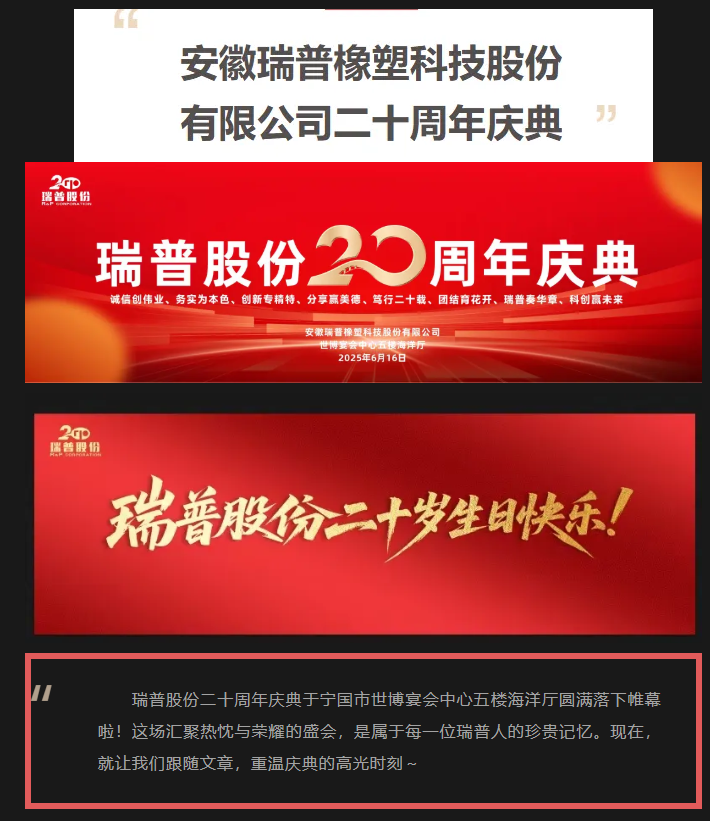 二十載櫛風沐雨,二十載砥礪前行。值此安徽瑞普橡塑科技股份有限公司成立二十周年之際,我們滿懷感恩與喜悅,誠邀您撥冗出席二十周年慶典活動,共同見證這一榮耀時刻,共敘情誼,共謀未來!